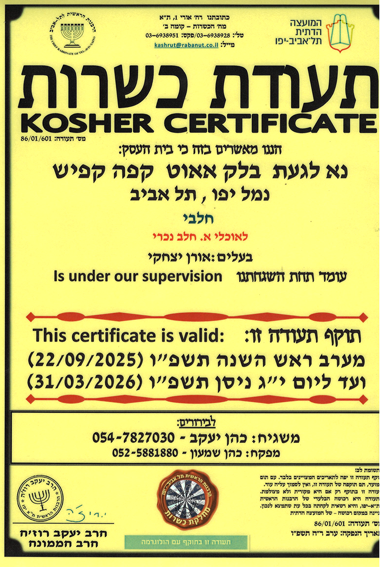 המסעדה כשרה בכשרות חלבית מטעם רבנות תל אביב – לתעודת הכשרות לחצו כאן
